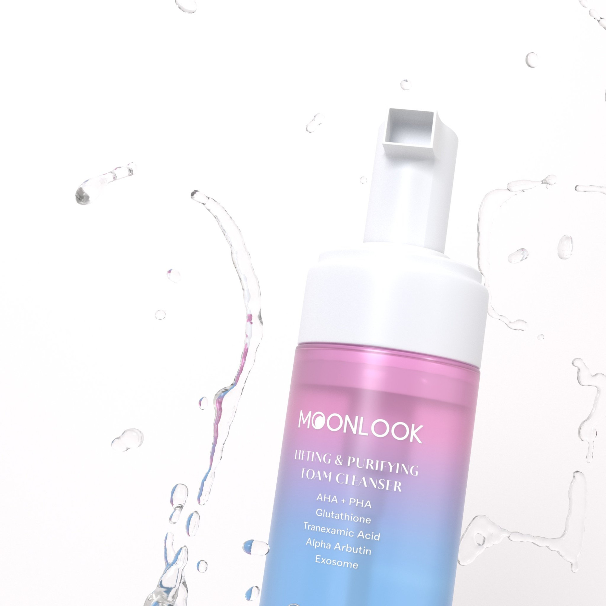 Bọt rửa mặt MoonLook với thiết kế đầu vòi tự động tạo bọt sẵn và chứa AHA/PHA và dịch nuôi cấy tế bào gốc Exosome kết hợp với Glutathione, Tranexamic Acid trong sản phẩm giúp khâu làm sạch rút gọn CHỈ VỚI 1 BƯỚC: